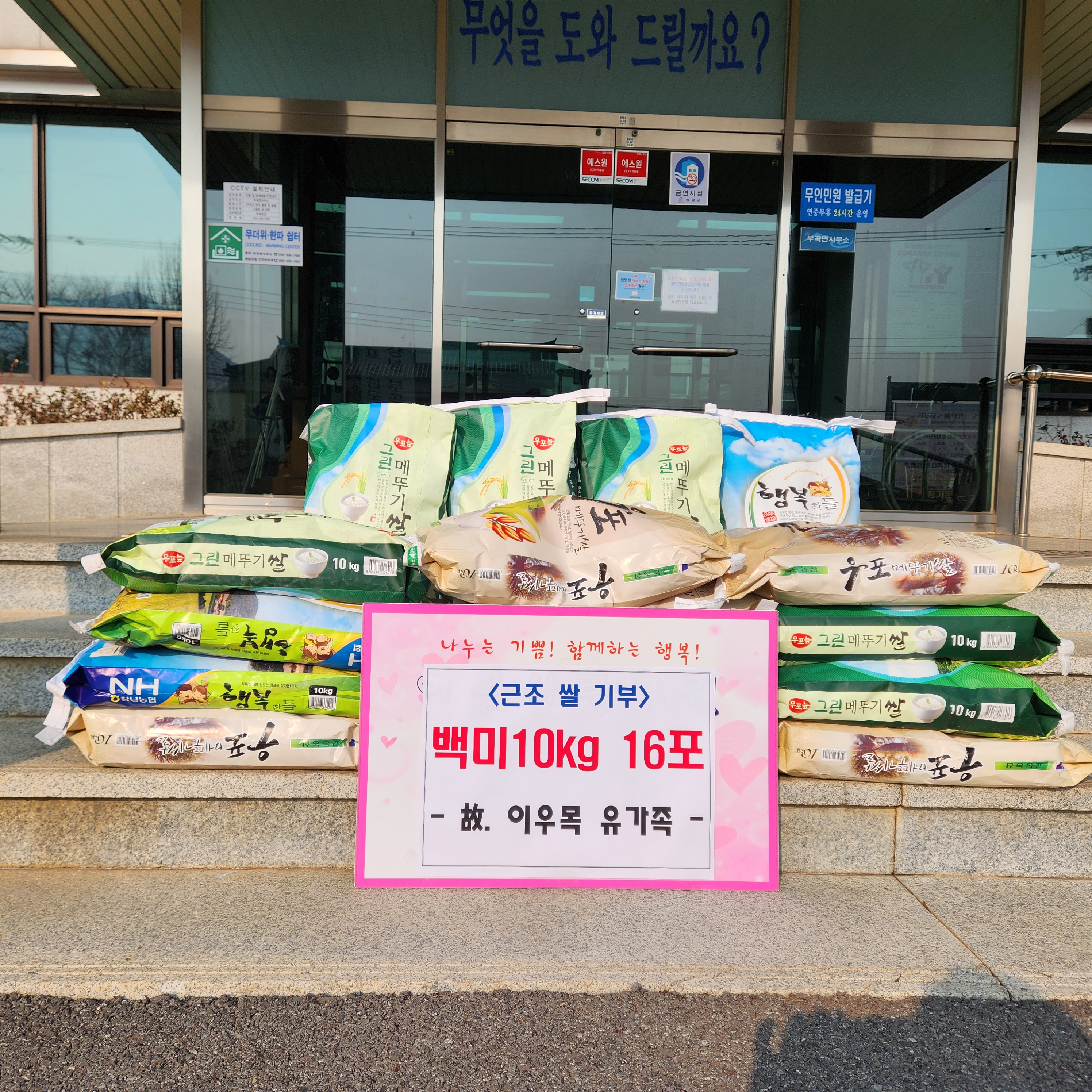 권태덕 면장은 “귀한 쌀을 기부해주신 유족분들에게 깊이 감사드리며, 고인의 뜻을 소중히 여겨 기부받은 쌀을 관내 어려운 이웃들에게 잘 전달하겠다”라고 전했다.