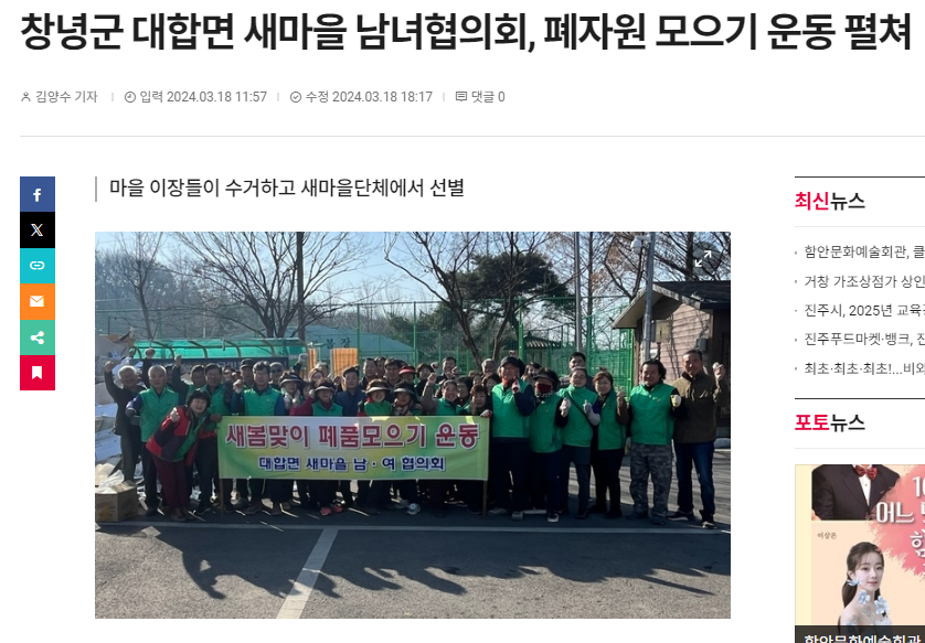 창녕군 대합면 새마을 남녀협의회, 폐자원 모으기 운동 펼쳐