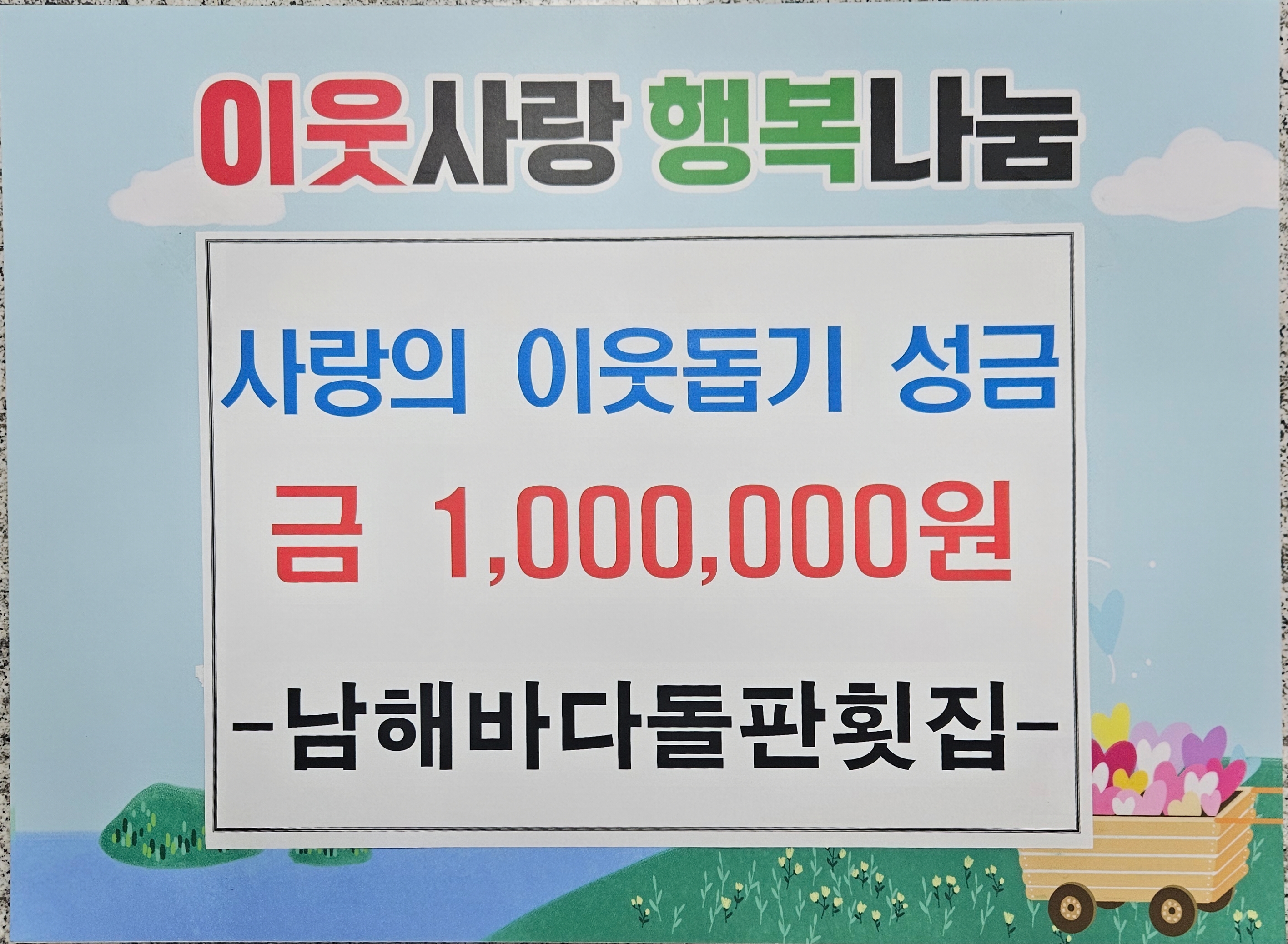 창녕군 창녕읍(읍장 성봉준)는 지난 17일 남해바다돌판횟집(대표 이정숙)에서 관내 취약계층을 위한 성금 100만 원을 기부했다고 밝혔다.